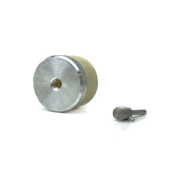 This polishing head is a 1.5″ x 3″ dense wool felt wheel with an aluminum backing plate to be along with cerium oxide to remove scratches in glass. With a 5/8″-13 threaded arbor and a 1/4″ drill adapter (included) removing scratches from glass will be a breeze. If you can feel the scratch with your finger nail, it may be too large to remove with this method.